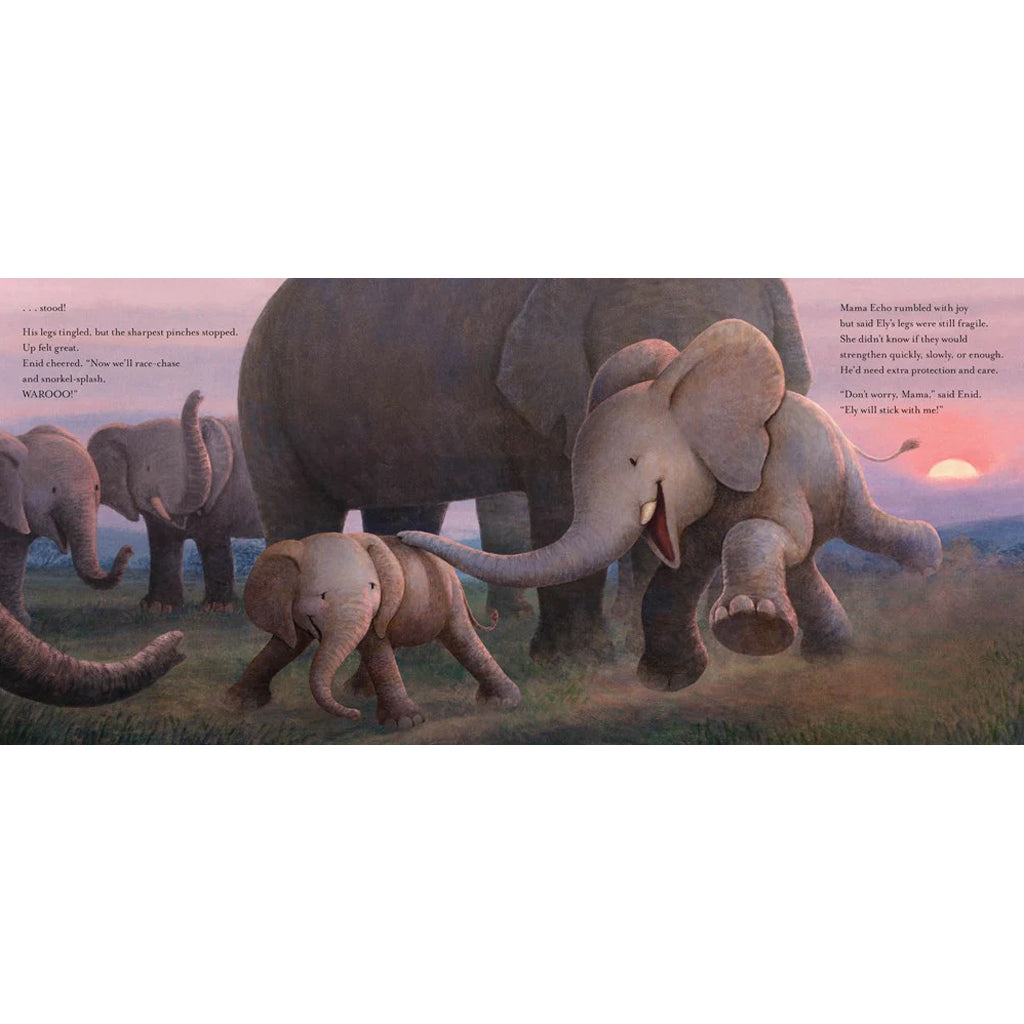 The moment he is born, Ely delights in the welcoming trumpets of his adoring big sister, Enid. She is so excited to play—but Ely’s legs are injured, and it’s hard for him to move. To help keep Ely safe, Enid sticks close to her determined brother as they grow together through the seasons, trunk-twirling, mud-wallowing, and making silly sounds!