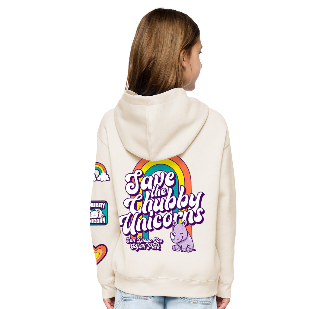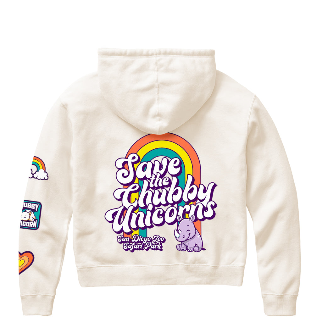 The cozy zip-front design makes it easy to layer, while playful sleeve artwork—including a rainbow, heart, and “Chubby Unicorn” badge—adds extra personality. Soft, comfortable fabric and a relaxed fit make this hoodie perfect for cool zoo mornings, school days, or outdoor adventures.